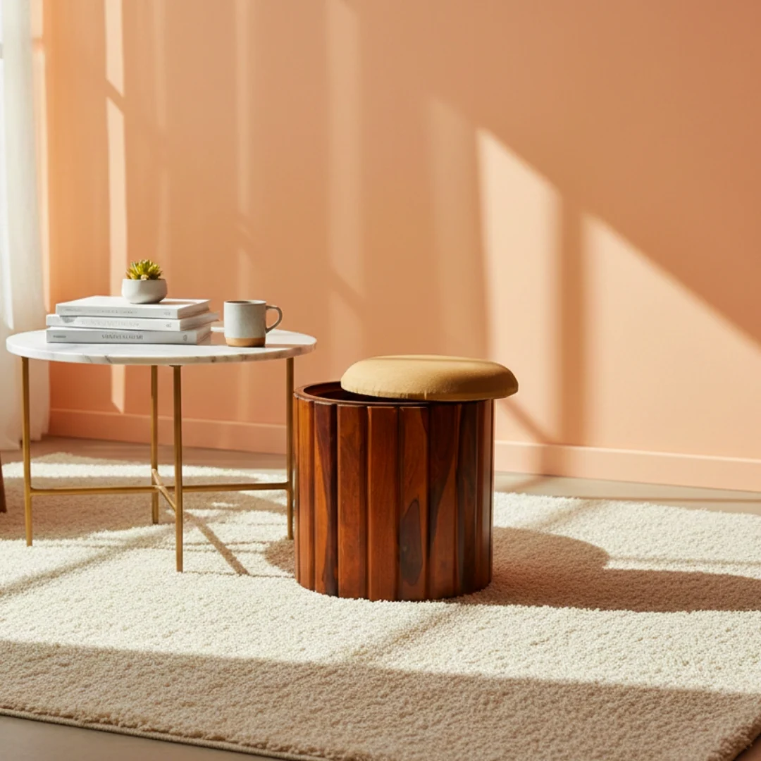 Add style and functionality to your home with the RtghCraft™ Storage Ottoman. Crafted from premium Sheesham wood, this multipurpose ottoman works perfectly as a seat, footrest, or hidden storage unit. Its lift-top cushioned lid offers ample space to keep essentials organized while enhancing your décor.